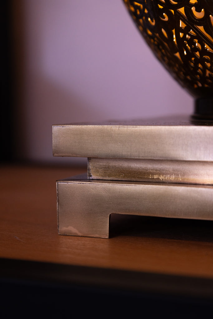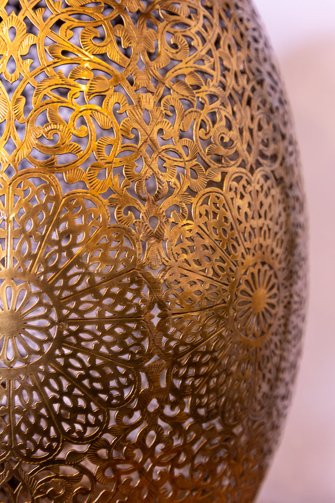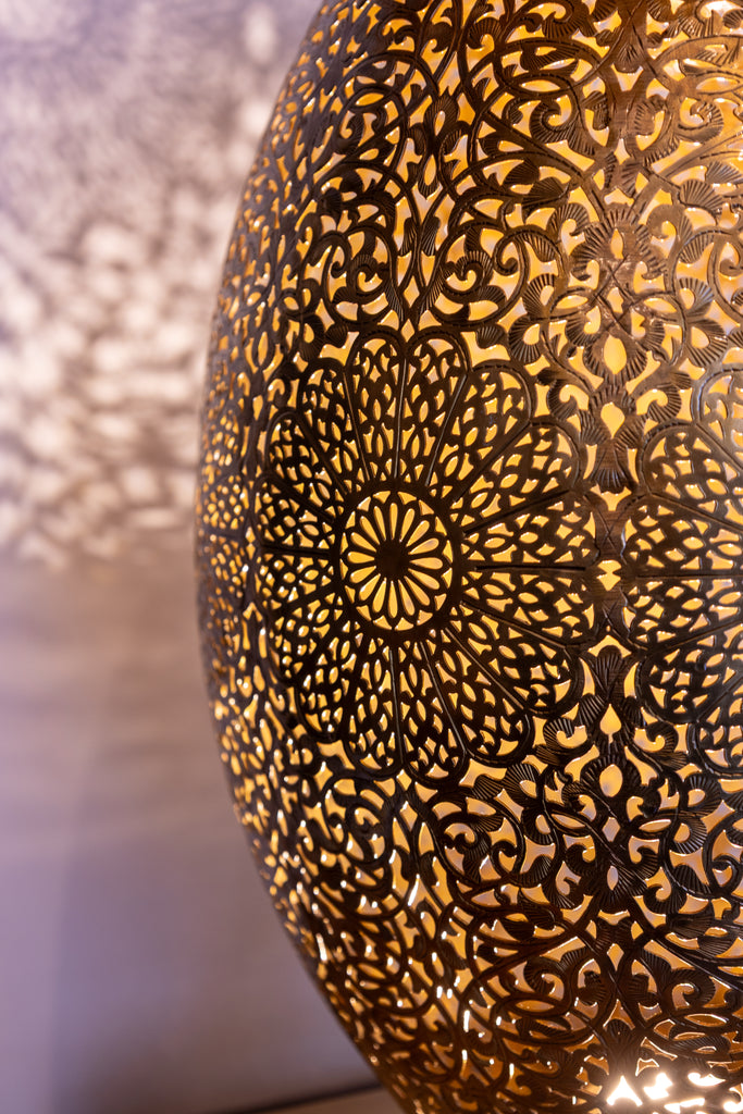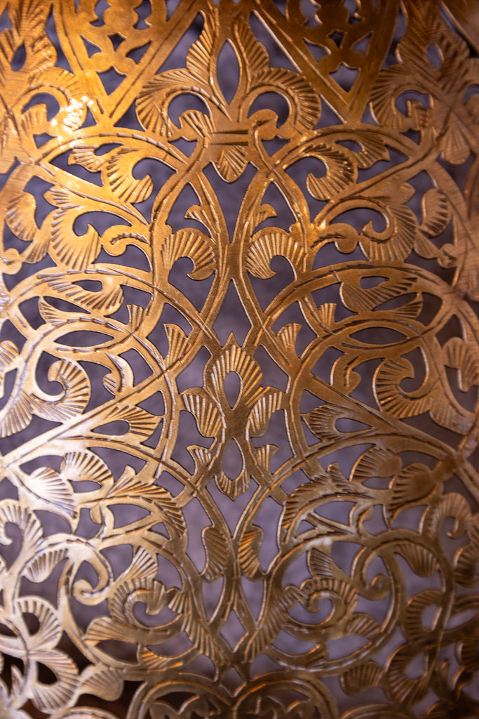 Stehlampe Palais Royal Messing 45cm wirft unglaublich schöne Schatten an die Wand, da sie oben offen ist, gibt sie ein angenehmes Licht. Die Lampe ist aus Messing mit feinsten Sägungen und Bohrungen.